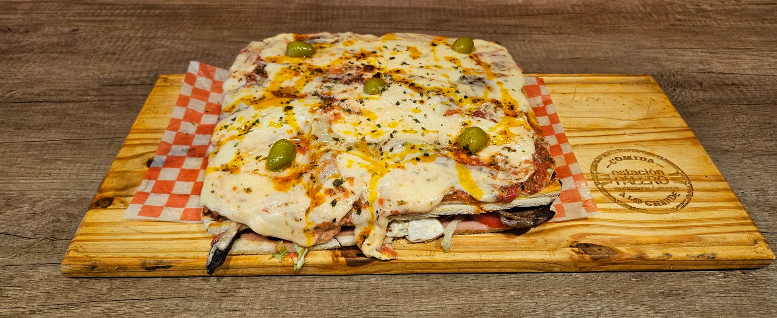 Triple de miga con jamón, queso, huevo, carne, lechuga, tomate y mayo. cubierto de muzzarella con aceitunas y chimi