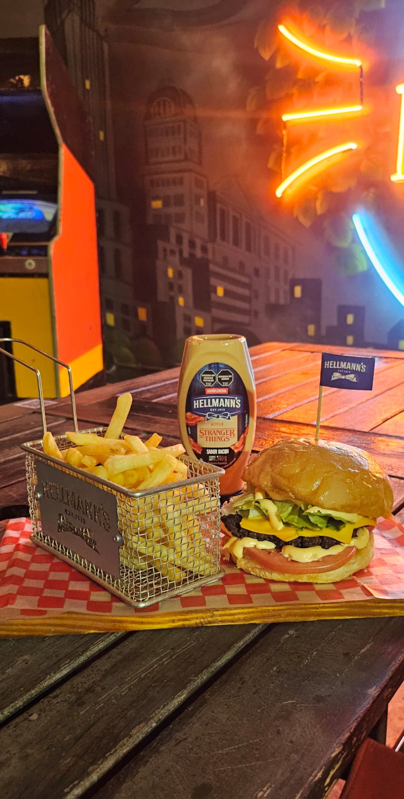 Pan de Papa, Carne, Cheddar, lechuga, tomate y Mayonesa Hellmanns Stranger Things