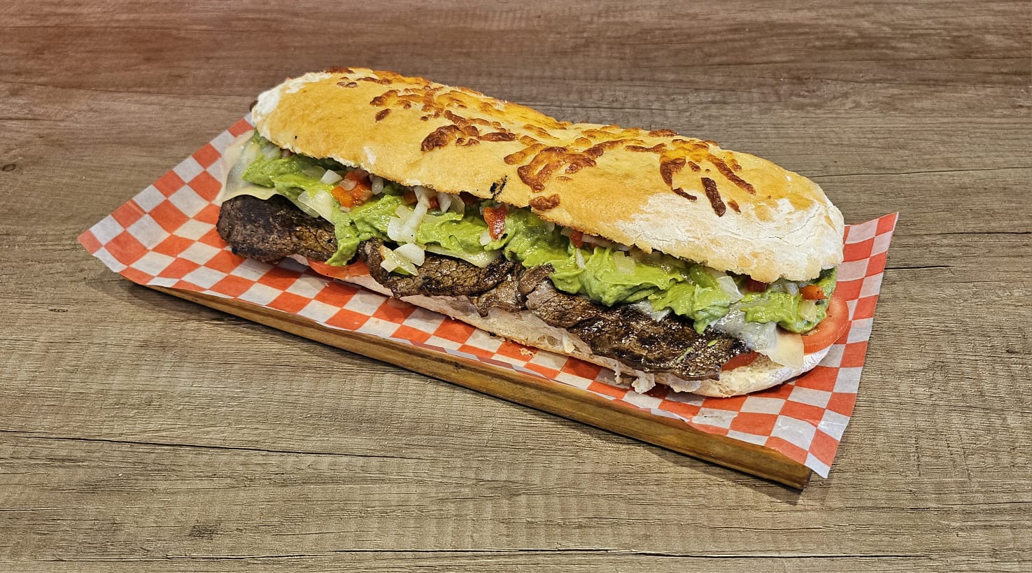 Pan árabe o casero, tomate, lomo, queso y y guacamole (palta, pimiento rojo, pimiento verde y cebolla).