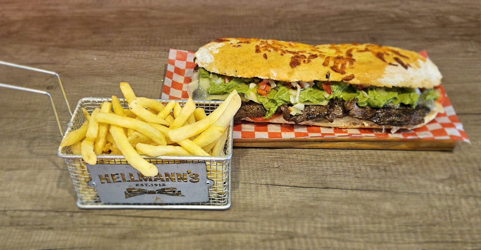 Pan árabe o casero, tomate, lomo, queso y y guacamole (palta, pimiento rojo, pimiento verde y cebolla). + papas fritas.
